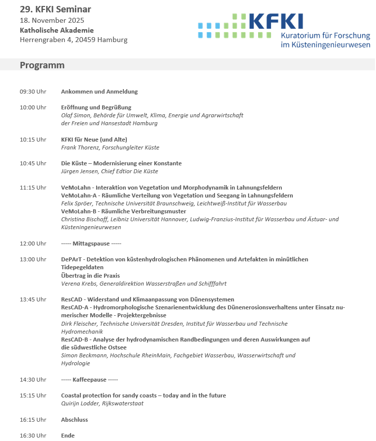 Ein spannendes Programm mit Beiträgen aus den laufenden KFKI-Projekten sowie ein Vortrag zu sandigen Küsten erwartet Sie auf dem diesjährigen KFKI-Seminar am 18. November. Die Anmeldung zur Veranstaltung in der Katholischen Akademie in Hamburg ist offen.